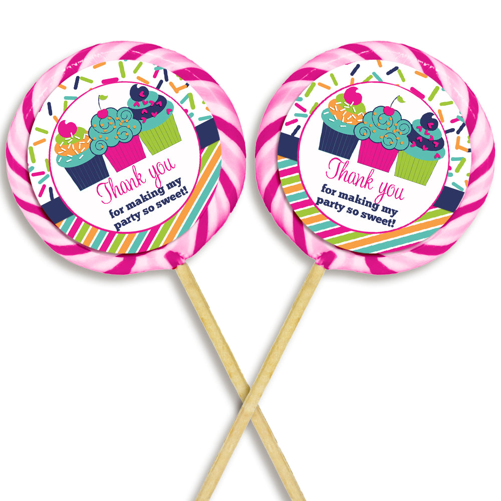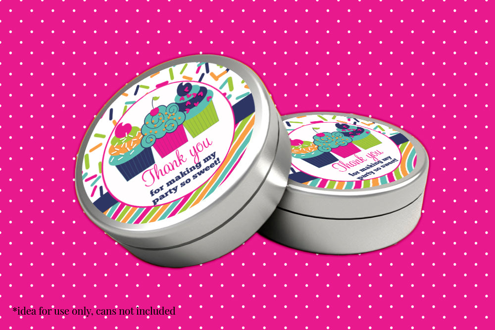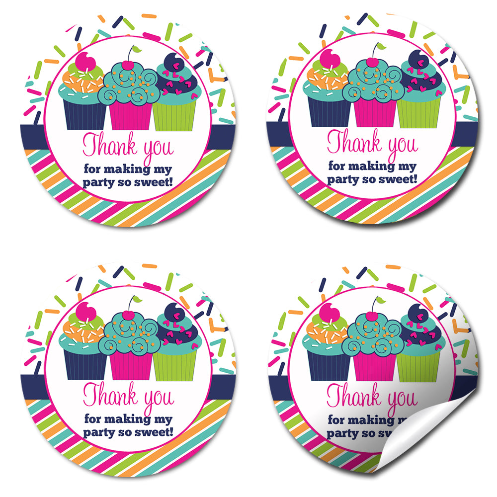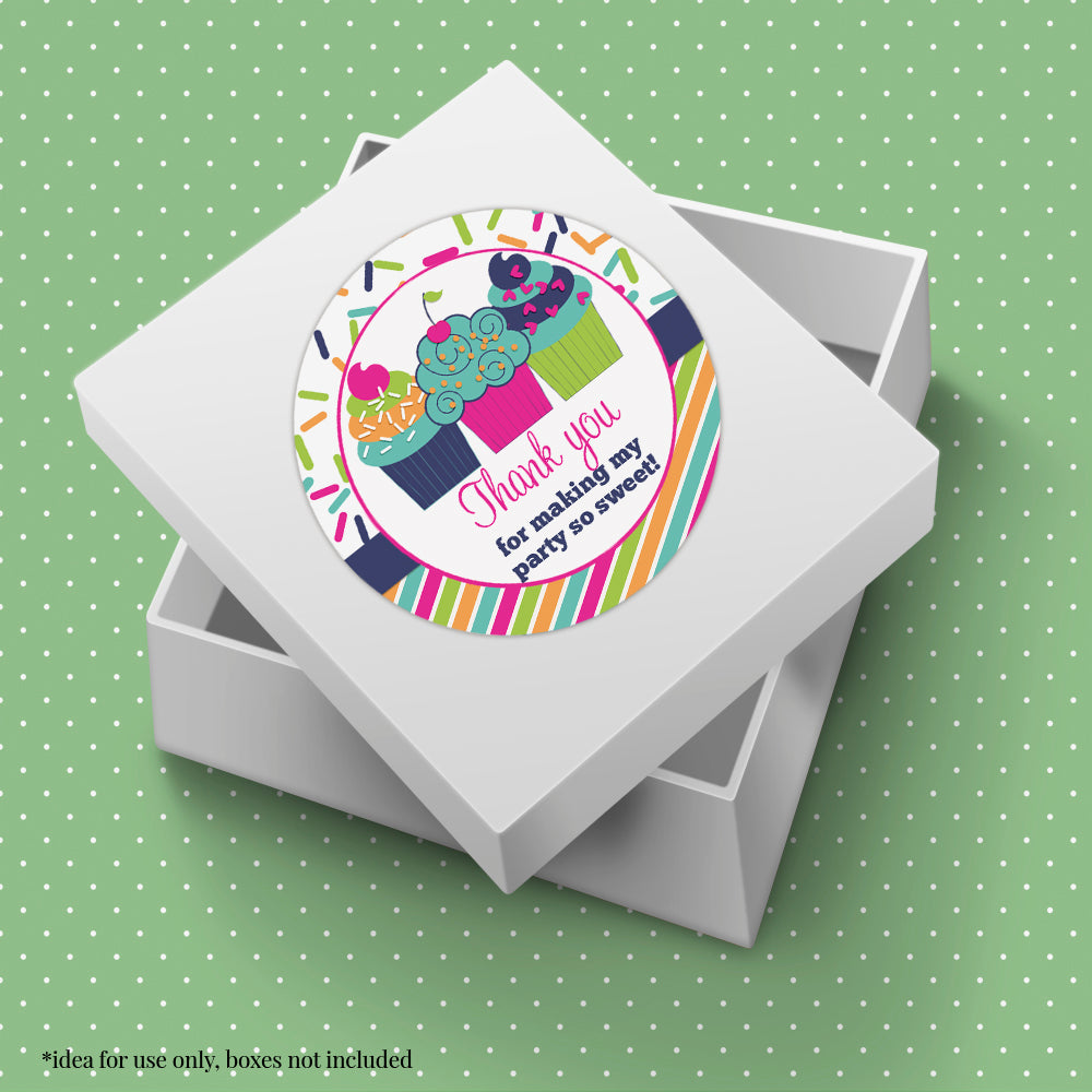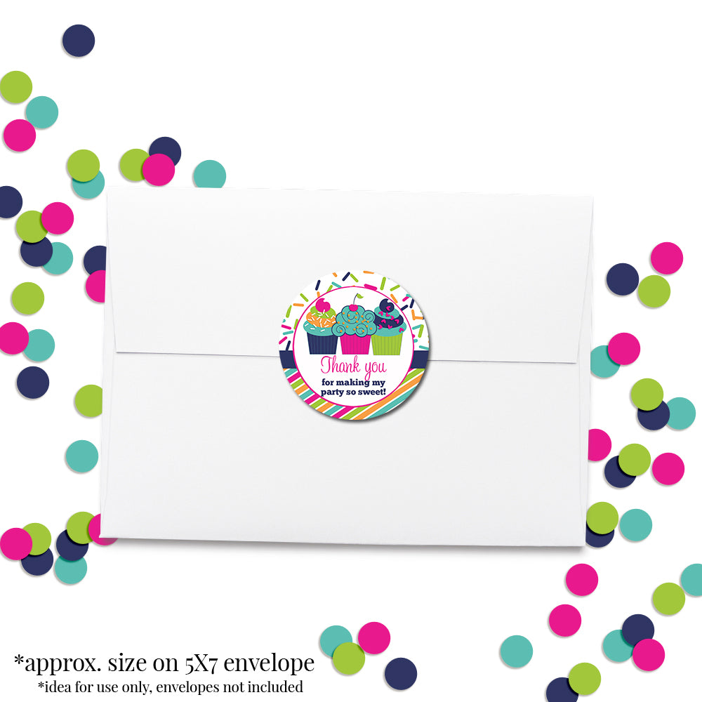 These cute stickers showcase three cupcakes against a lively and vibrant confetti and striped background in teal, orange, pink, green, and navy. These fun cupcake stickers are perfect for thanking guests for making the party extra SWEET!